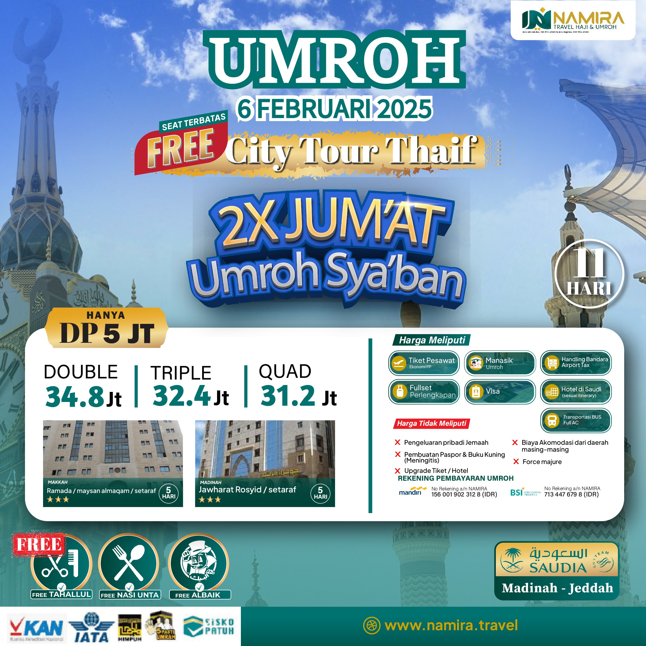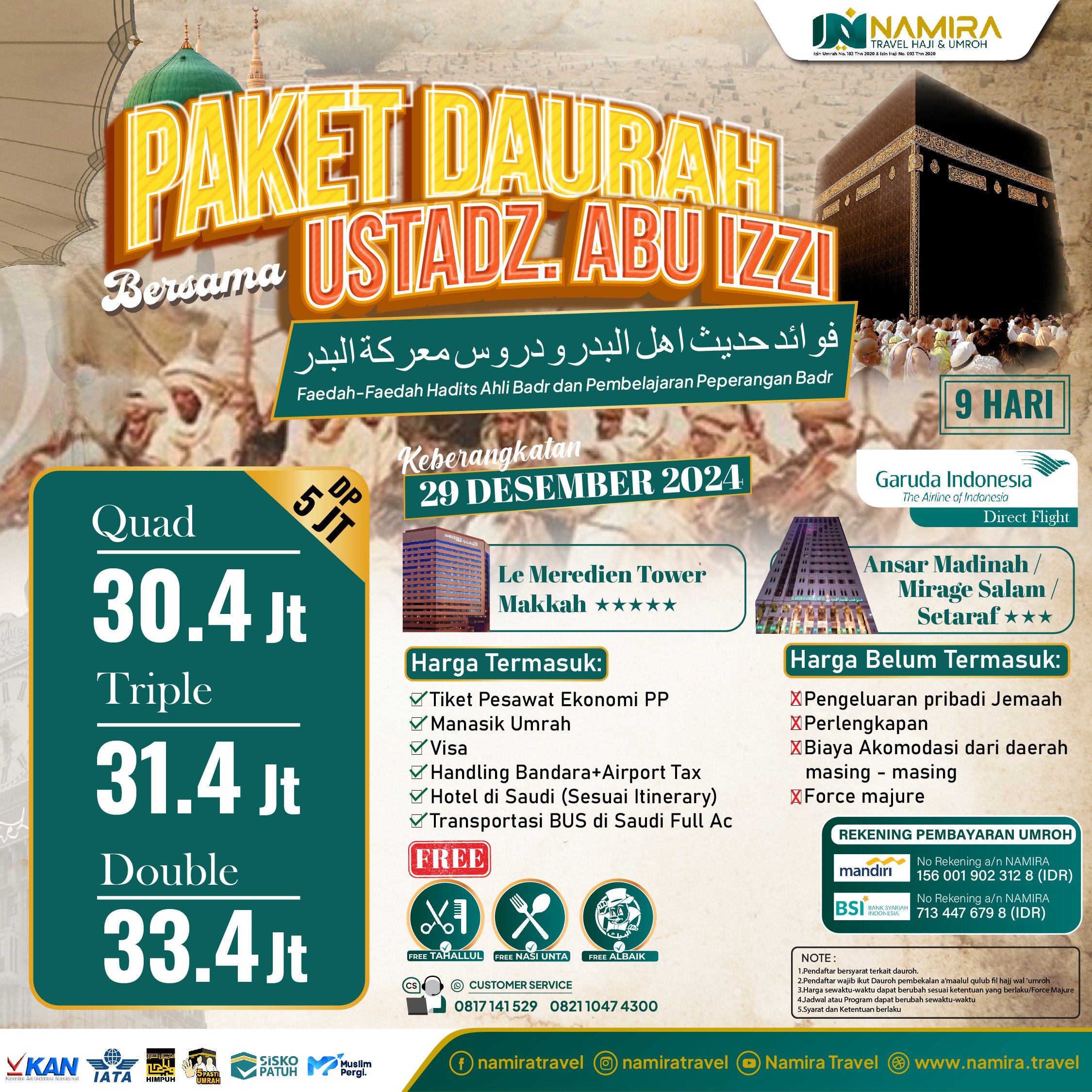 Harga paket tour yg ditawarkan sangat terjangkau. U/ pelayanan dari CS, pesawat, hotel dan pendampingan muthowif the best
